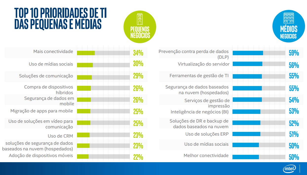 São Paulo, 28 de setembro de 2016 – Os investimentos em TI pelas pequenas e médias empresas brasileiras deve saltar de US$ 48 bilhões em 2016 para US$ 63 bilhões até 2020, com as tecnologias baseadas em computação em nuvem e mobilidade crescendo de três a sete vezes mais rapidamente do que as tecnologias tradicionais on premise. Os dados são da pesquisa 2016 Brazil Small & Medium Business: ICT & Cloud Services Tracker Overview, realizada pela AMI Partners a pedido da Intel Brasil. O estudo mapeou tendências e perspectivas na migração para novas tecnologias em todo o universo brasileiro de pequenas e médias.